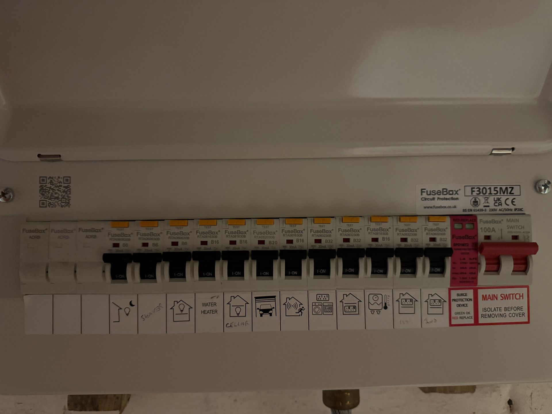 I supplied and installed a modern metal 11-way RCBO consumer unit with built-in surge protection. Every circuit was tested, labelled and issued with certification. The new board gives instant protection against faults and is far safer than the previous setup.